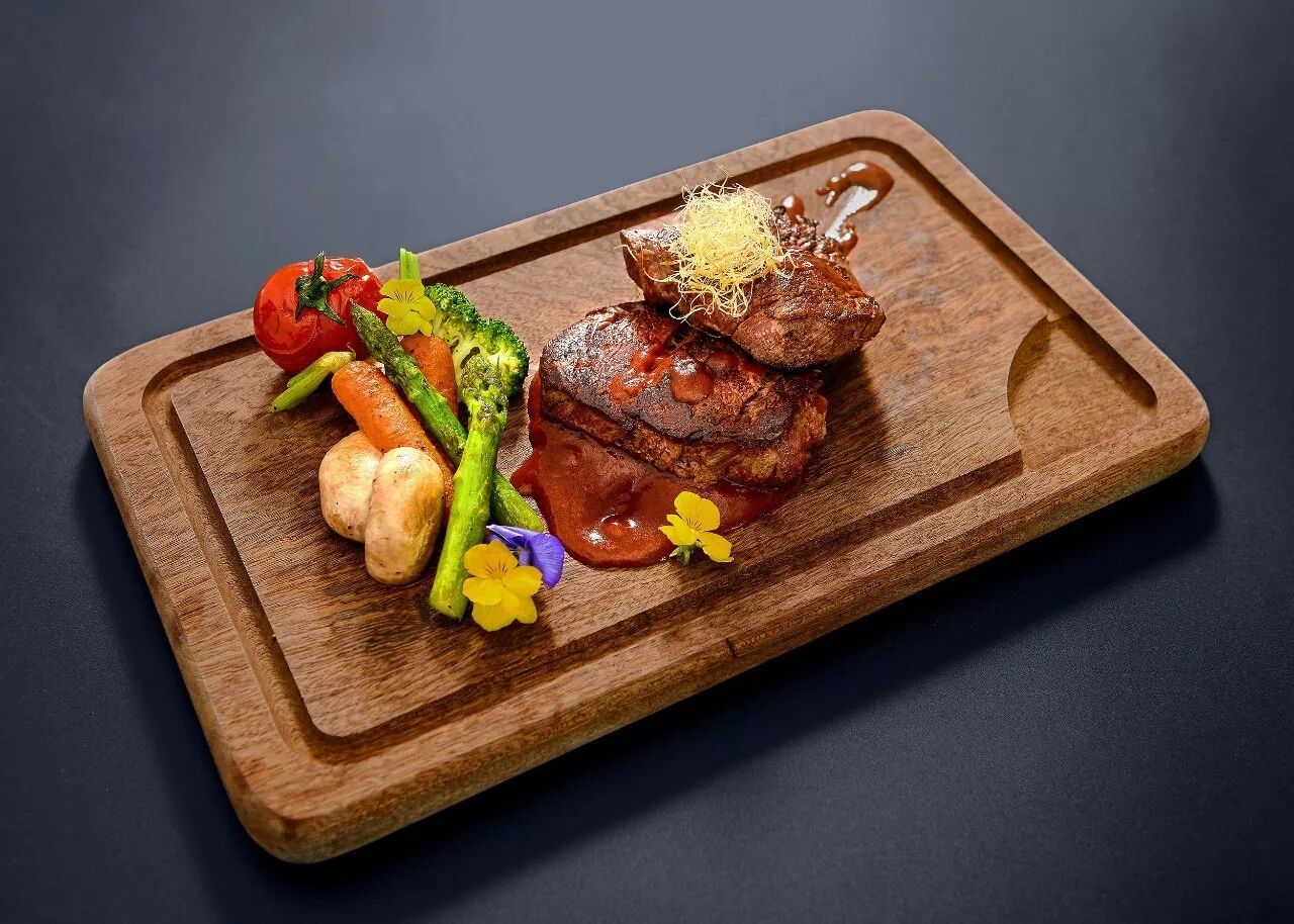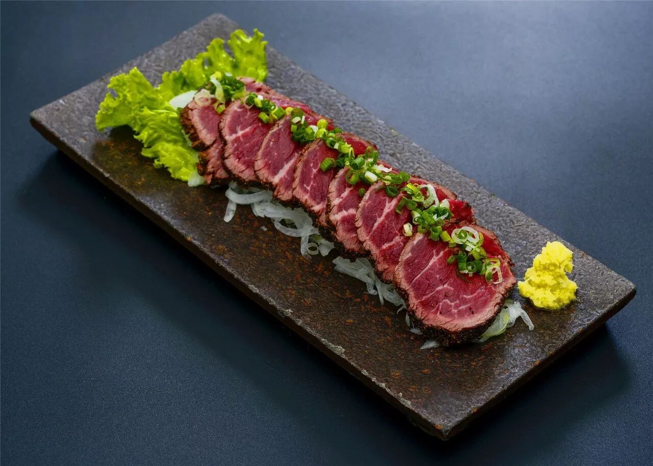 外层烤得焦香、里面还保持着粉红嫩软的肉质,搭配日式酱油调制的和风酱汁,夹起小葱和洋葱丝一起入口,口感比牛排更为清爽。这样的烹饪方法,对牛肉的品质要求也是相当高的。