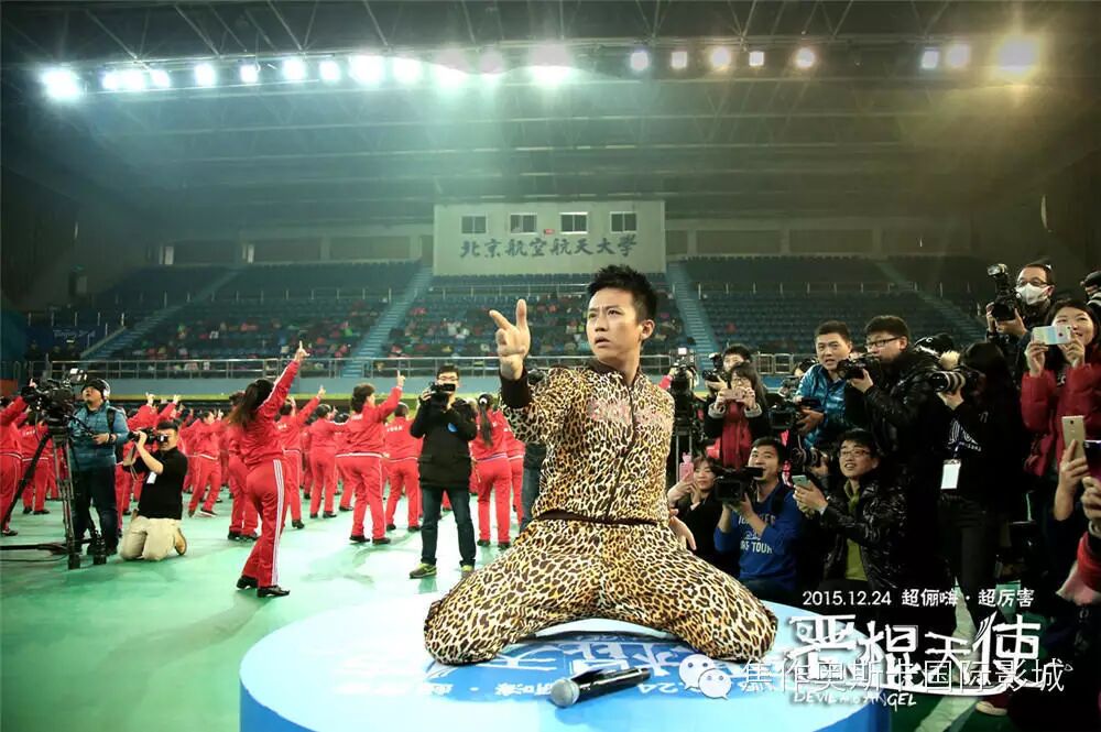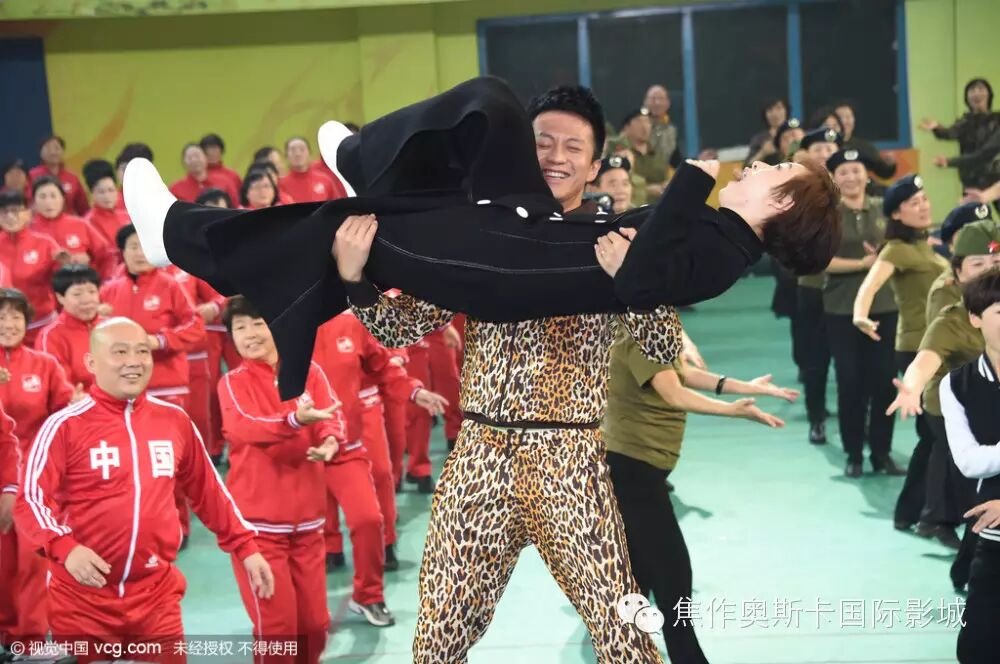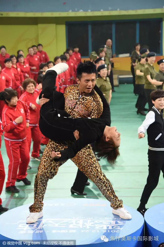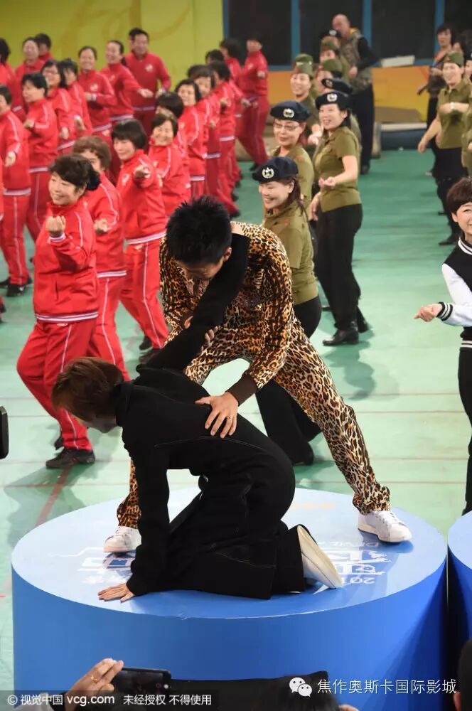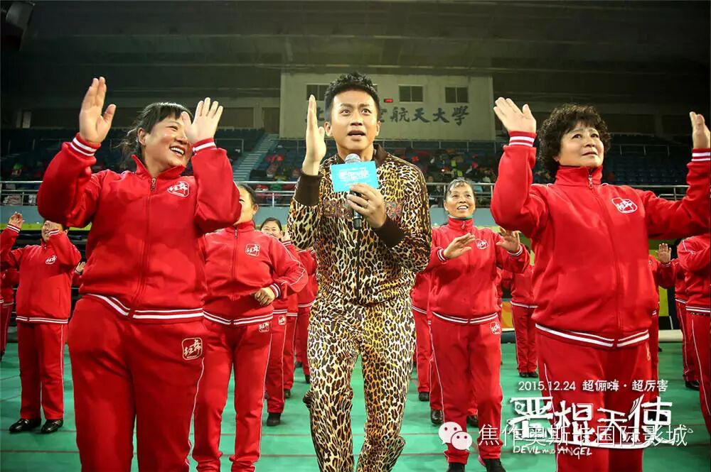 发布会一开始,400名大妈身穿炫酷战衣,以潇洒帅气的“水兵舞”和“小苹果”开场,拉开了广场舞代言人发布会的序幕。而随后,在主持人的介绍下,邓超也入场,并偷偷在大妈后面开始PK起舞姿来了。