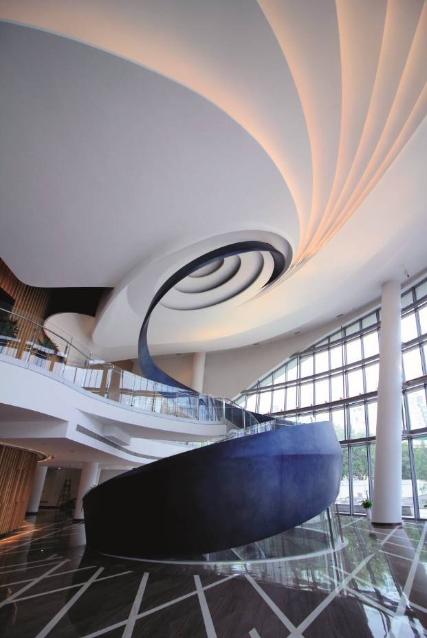 舞蹈中心专注于舞蹈,所以设计师自始至终坚持不论从建筑还是室内设计均要传达出“舞动”的美感,这在2号楼剧场室内设计上更是表现得淋漓尽致。大剧场内的旋转楼梯仿佛一道蓝色飘带,与穹顶相连。穹顶的设计也仿若舞者的裙摆,层叠相交。目睹过舞蹈中心芳容的人很难不被这道楼梯所吸引,这是上海国际舞蹈中心的“神来之笔”。此项施工工艺在国内绝无仅有,汇集了众多建设者的辛劳和智慧。所有参建者秉持“工匠精神”,精益求精,才会有今天的“神来之笔”。拥有48个专业舞蹈排练厅、“弹簧式”地板……国家大剧院舞蹈艺术总监赵汝蘅用“羡慕嫉妒恨”来解读舞蹈中心,国际舞蹈家们惊叹这是世上舞蹈家的天堂。