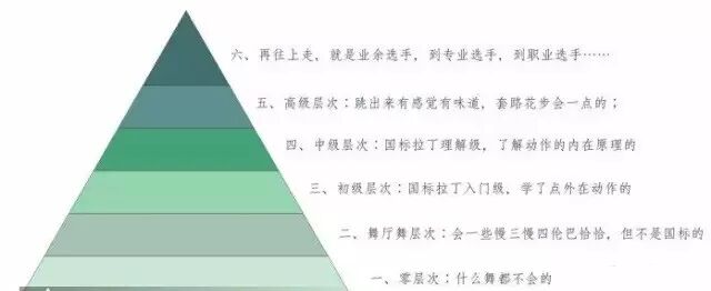 其中,一些平时要上班、业余跳跳舞的人群,如果喜欢上国标舞,从而自学或者报名培训班之类的,一般就属于第二、第三、第四、第五层次中的某一层了。