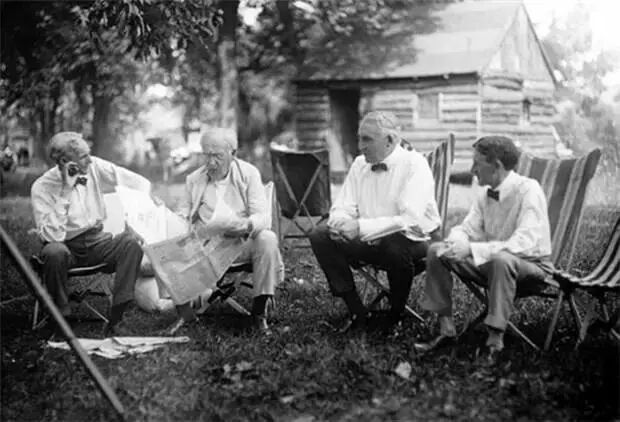 ▼ 从左至右依次为:亨利·福特,托马斯·爱迪生,美国第29任总统哈丁以及商人哈维·费尔斯通,1921年