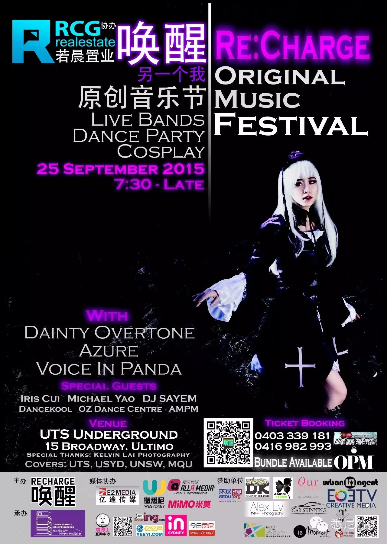 Cosplay原创音乐节Live Music Dance Party 将于9月25日6点30持续燃烧至次日凌晨!从之前的400人改到超过700人的狂欢,超过20位Cosplay参赛者,神秘悉尼本土著名歌手嘉宾倾力表演,四所名校,三支现场乐队,两支嘻哈舞团,DJ和说唱艺人,保证带给你整整一晚,悉尼变装灯光音乐动感派对的全新感受。让那些你熟悉的翻唱,和打动你内心的原创,引发你灵魂最深处的共鸣和激情,不停止的动感音乐让你忘记身处异国他乡的孤寂。