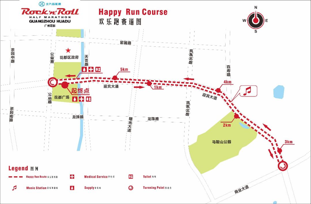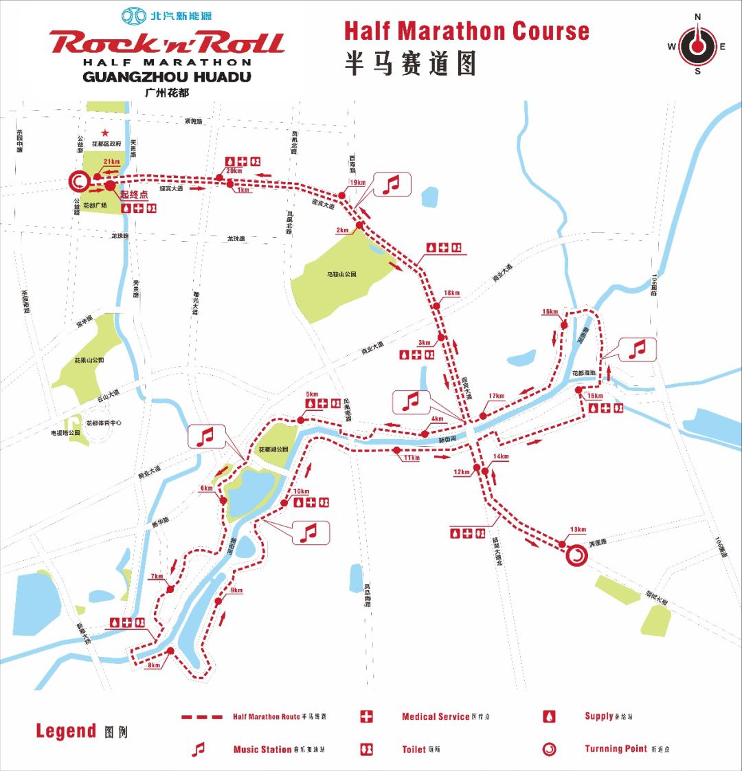 北汽新能源·广州花都摇滚马拉松的起点和终点均为花都广场,途径著名的花都湖公园以及花都湿地公园,参赛选手在乐跑马拉松享受摇滚乐的同时,还能将花都的美景尽收眼底。