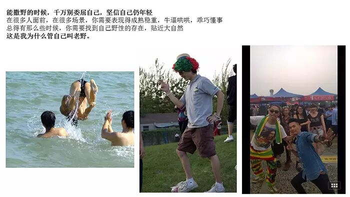还小的时候,野孩子天一亮就跑出去玩,天黑回到家时满身是泥。现在呢,他撒野的方式,可能是去到湖边纵身一跃,自由在水中;也可能是音乐节,从早喝到晚;又可能是突然出现在拍照妹子面前;还可能是一次突如其来的裸奔(那是一个大学城的雨夜,全裸的老野果断出门,奔跑在了大学城的某一段路……)……