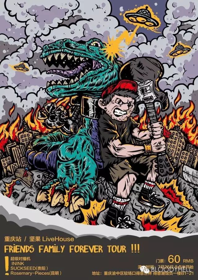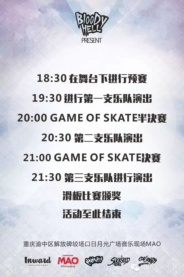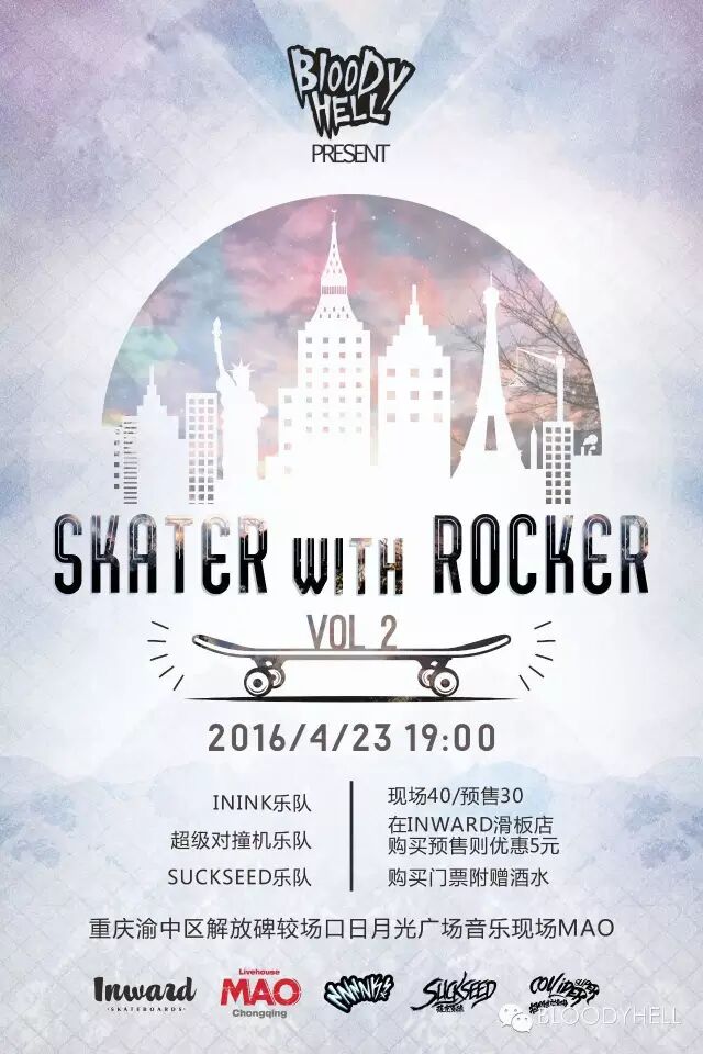 4月23日 BLOODYHELL厂牌联合INWARD滑板店 鼎力呈献“SKATER WITH ROCKER”VOL.2 作为BH2016年首场活动,我们将会玩个大的!开创重庆首次场内SKATE比赛与摇滚演出交替进行。硬核、流行朋克多种类风格音乐轰炸你的大脑,别害羞赶快加入进来!MOSH Pit不会停下,年轻朋友的聚会不会停止。