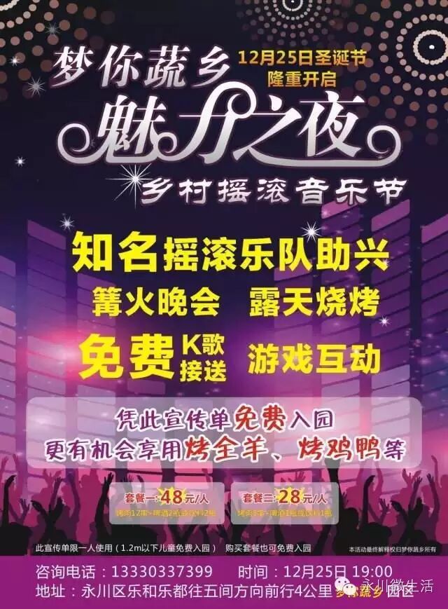 “梦你蔬乡·魅力之夜”乡村摇滚音乐节暨梦你蔬乡二期开园仪式将于2015.12.25盛大开启,届时为大家准备丰富的节目表演、游戏互动以及精美礼品。