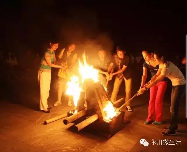 1、点火仪式(每组派出两名代表高举火把共同点燃篝火);