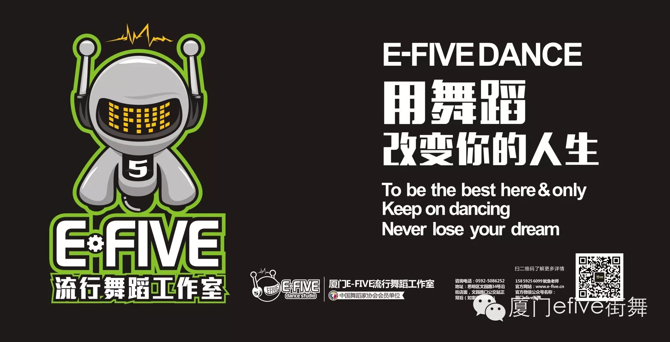 厦门E-Five流行舞蹈工作室是厦门最专业的街舞工作室,成立至今已有10年历史,同时E-FIVE也是厦门最老牌的街舞团队。本机构为中国艺术家委员会旗下的中国舞蹈家协会正式会员单位,以及中国IM国际编舞联盟正式会员单位,是非常专业以及正规的流行舞蹈机构。E-FIVE流行舞蹈工作室拥有3家斥资百万打造的厦门顶级专业舞蹈工作室,及厦门最顶级的专业师资力量。新老队员至今已拥有100余人,任课导师40余人,近几年获奖无数,基本包揽厦门及福建各大街舞赛事冠军!