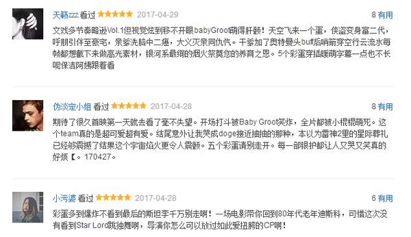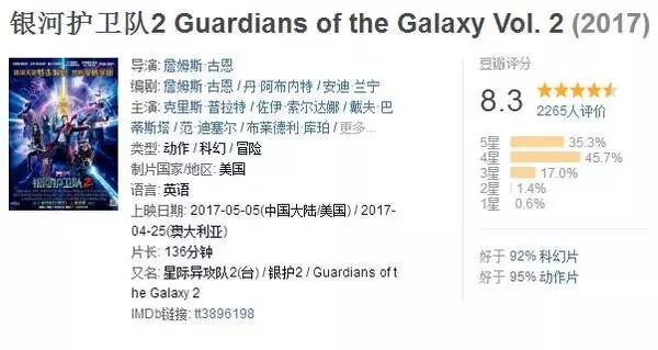 《银河护卫队2》的豆瓣评分8.3,高于前作的8.1。