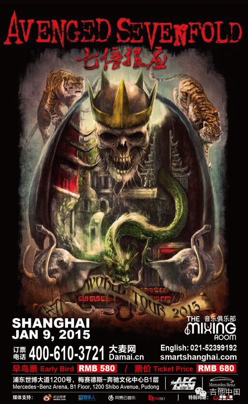 (2014年12月9日,中国) AEG 中国携手太合互动及音乐俱乐部今日正式宣布,美国另类摇滚乐队七倍报应乐队(Avenged Sevenfold)将于2015年1月8日首次亮相中国,登上北京汇源空间(万事达中心内)的舞台献上中国首秀,1月9日乐队将转战上海The Mixing Room音乐俱乐部,为中国歌迷带来最震撼的摇滚视听盛宴。