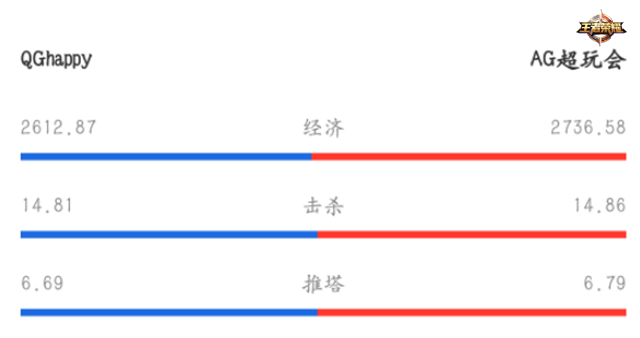 从季后赛的数据来看AG超玩会都以微小的优势超过QGhappy,在经济、击杀和推塔方面均稍稍高于QGhappy,这些数据也足以证明双方实力差距是十分细微的。但从中也不难看出AG超玩会在季后赛的状态更佳!