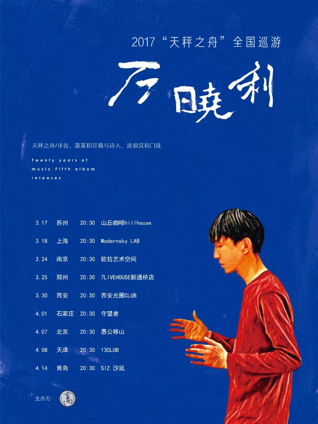 去年底天秤之舟的航线先抵达南方的七个城市,今年三月将驶往北方。分别是:苏州,上海,南京,郑州,西安,石家庄,北京,天津,青岛。此次演出内容将以新歌及旧作的重新编排为主,中途也会安排一些暂时保密的意外之喜。总之,万晓利的每一次发声都是与以往的升华,此次到底是磅礴的飓风,还是奔放的浪潮,需要你来见证!当天秤之舟暂时停泊在你所在的城市,就快来感受不一样的潮汐吧!