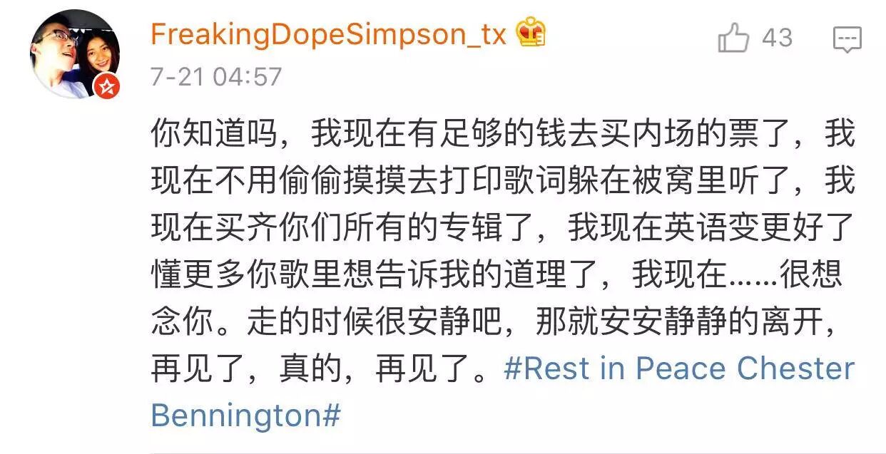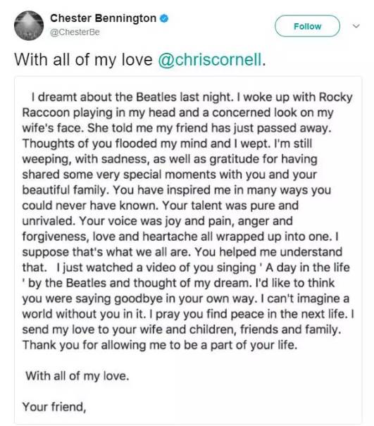 每一个耳机里循环过林肯公园的人,都明白Chester的离去是多么痛的打击。