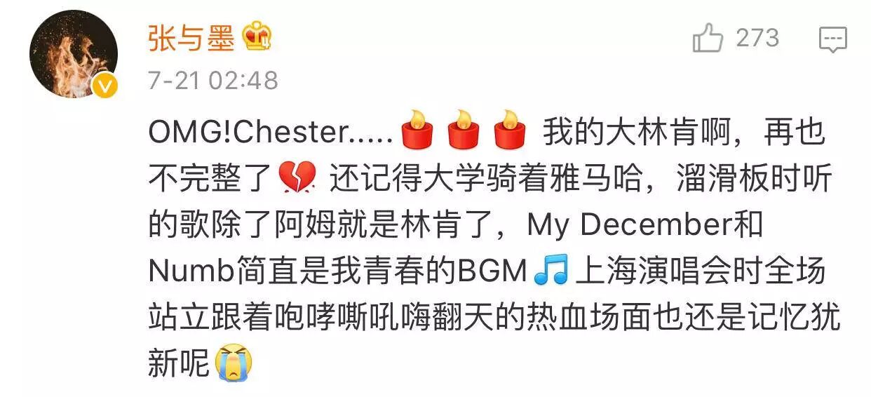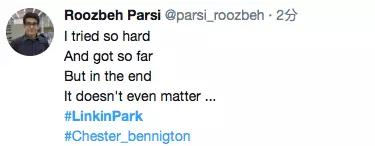 “不不不,拜托不要是他!林肯公园是我的最爱之一。安息吧查斯特·班宁顿,你的歌声永远都在。”