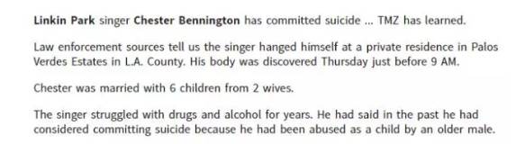 关于Chester的死因众说纷纭,据TMZ报道,Chester最近几年来饱受酒精和毒品的折磨,曾经也透露过的想法,因为小时候遭受过虐待。