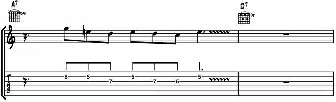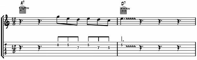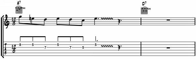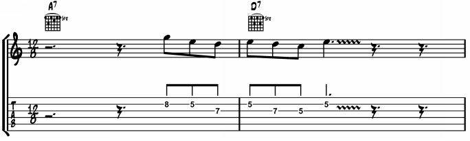 这一次听起来大不一样因为超过一半的音符都落在了D7上,之前都是A7为主。