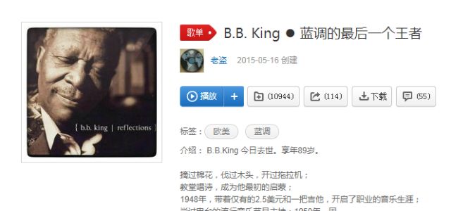 某日某月某音乐平台,热心的乐迷制作了这样的一个歌单。标题,引用了15年离世的BB老爷子做噱头,Blues也成了被他“调戏”的对象。老爷子功成名就所向披靡时不争的事实,可我想,也许作者只看到了历史的片面,B.B.King是蓝调界的王者,但是他还有后继人。