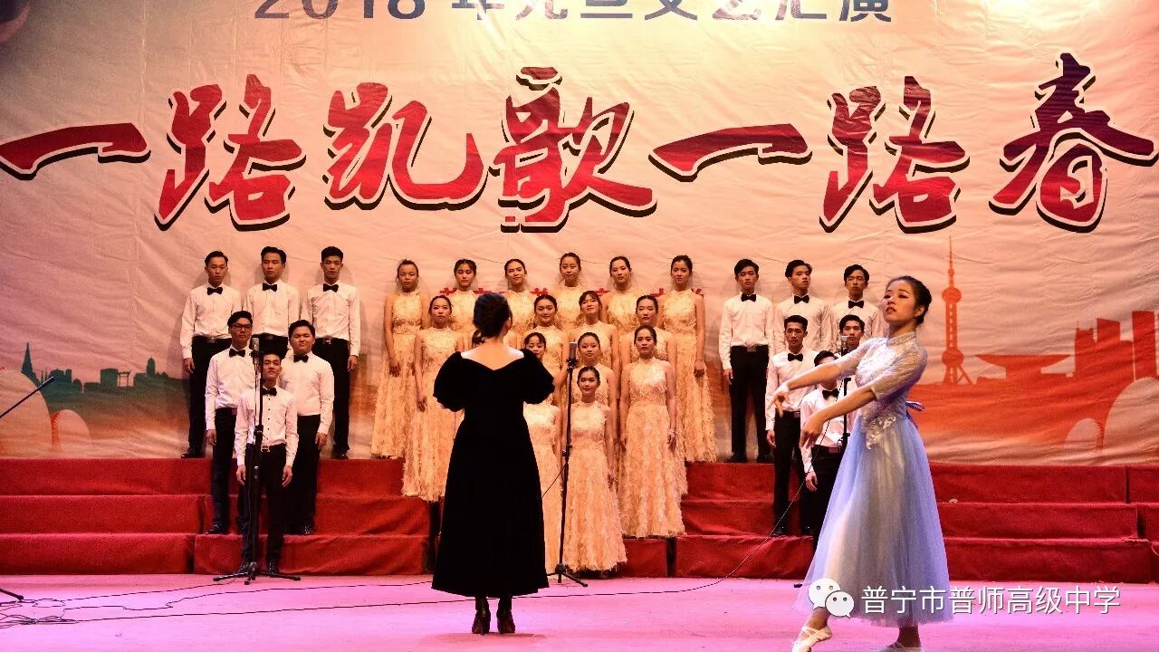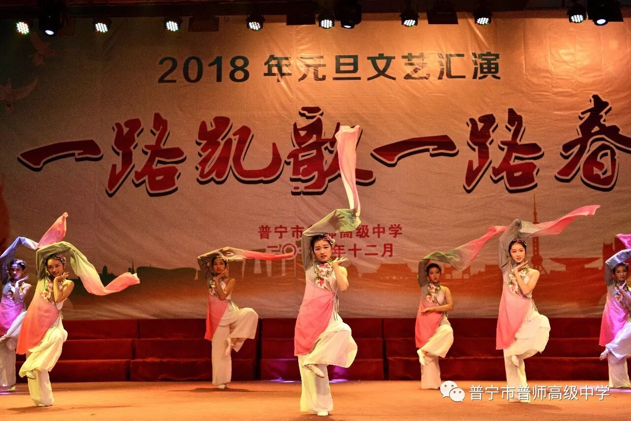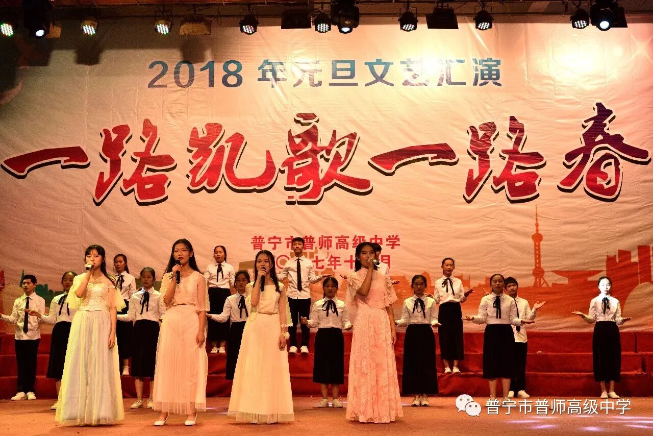 在辞旧迎新之际,为了喜迎元旦,丰富校园生活,展示学子风采,2017年12月25日下午,普师高级中学在大礼堂隆重举行以“一路凯歌一路春”为主题的2018年元旦文艺汇演。礼堂内灯光璀璨,人潮涌动,元旦文艺汇演的火热上演,给全校师生美的享受,现场弥漫着节日的欢快氛围。