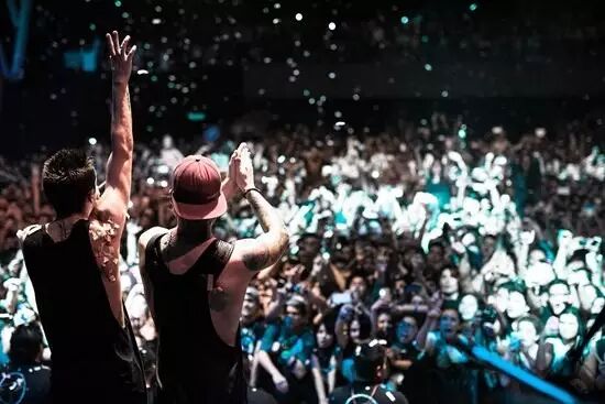 但是21飞行员就实在是太酷了,Tyler Joseph及Josh Dun这俩哥们总喜欢在演出的时候扮演得像是来抢银行的,其中泰勒这哥们在舞台上一边弹键盘一边RAP的场景,真的让人过目不忘——