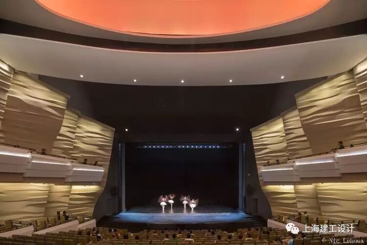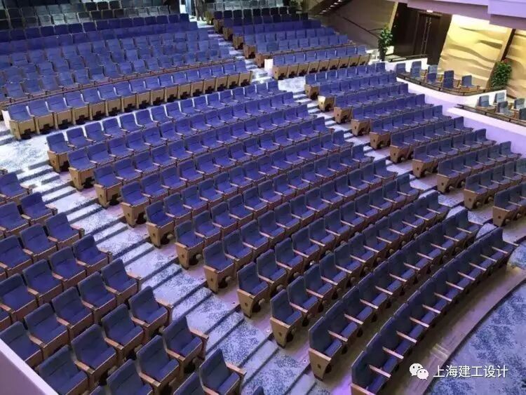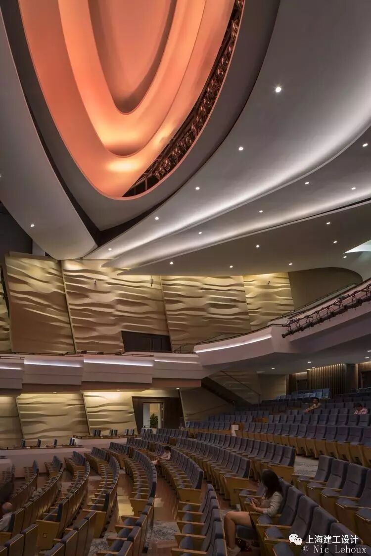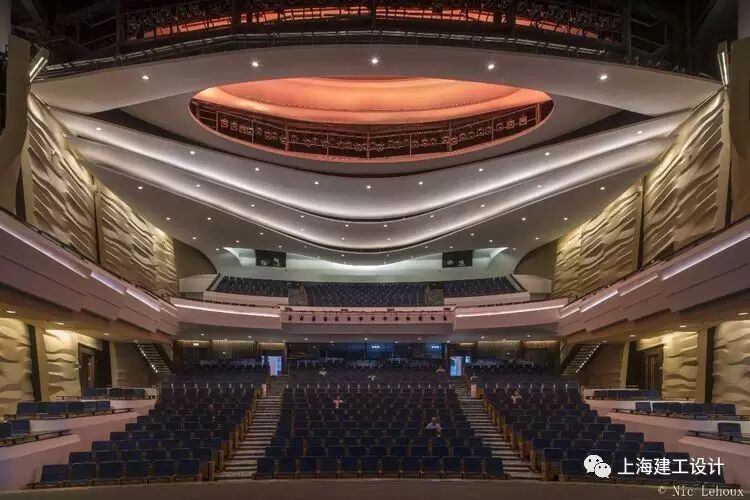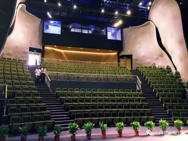 两个剧场的颜色挑选也有讲究:大剧场的坐席以蓝色为主色调,小剧场以草绿色为主色调,均迥异于国内剧场的坐席设计。舞蹈中心选蓝、绿两色,则出于这样的考虑:蓝色代表海派文化,海纳百川。草绿色代表创意产业,清新,文艺。