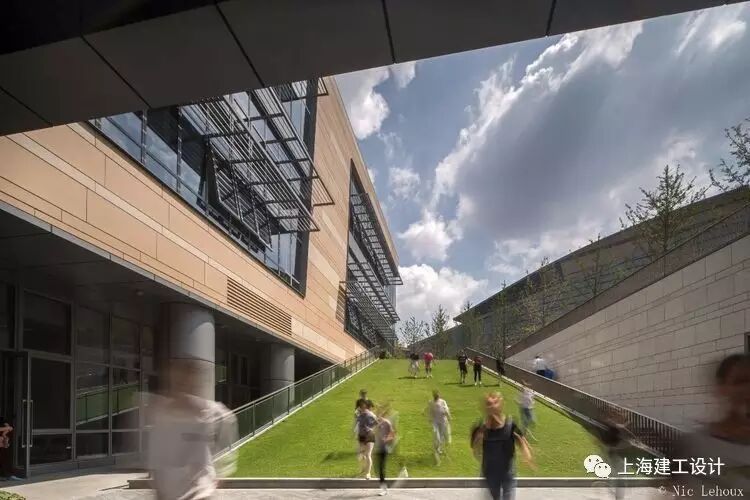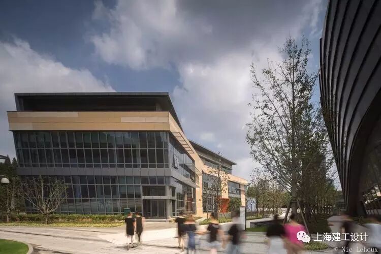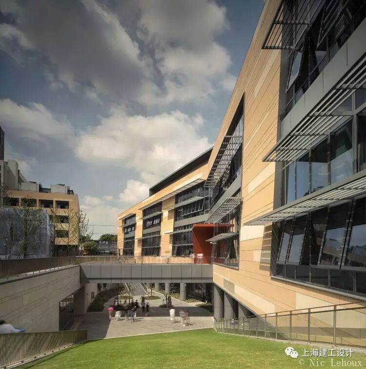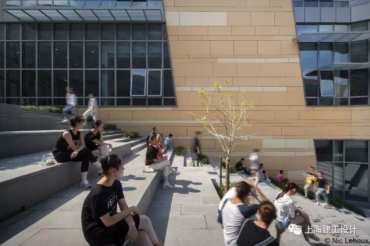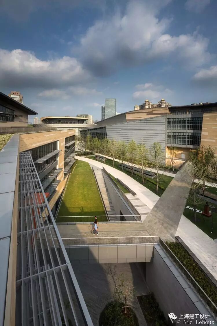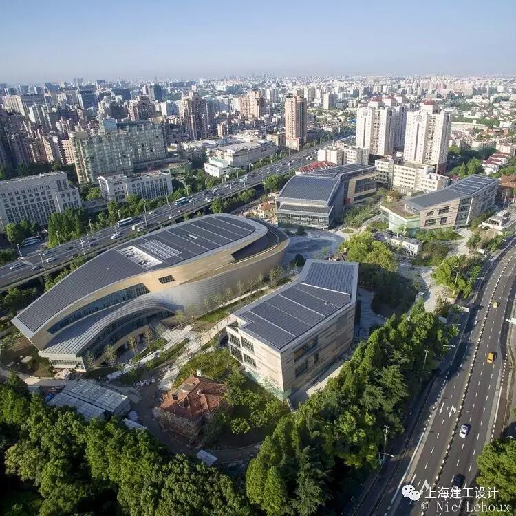 上海国际舞蹈中心注重倡导绿色理念。原来园子里的老树、大树几乎都保留了下来,六幢小洋楼修旧如旧,新建筑外立面大面积使用无污染的陶土板,还配备了太阳能、雨水回收装置。