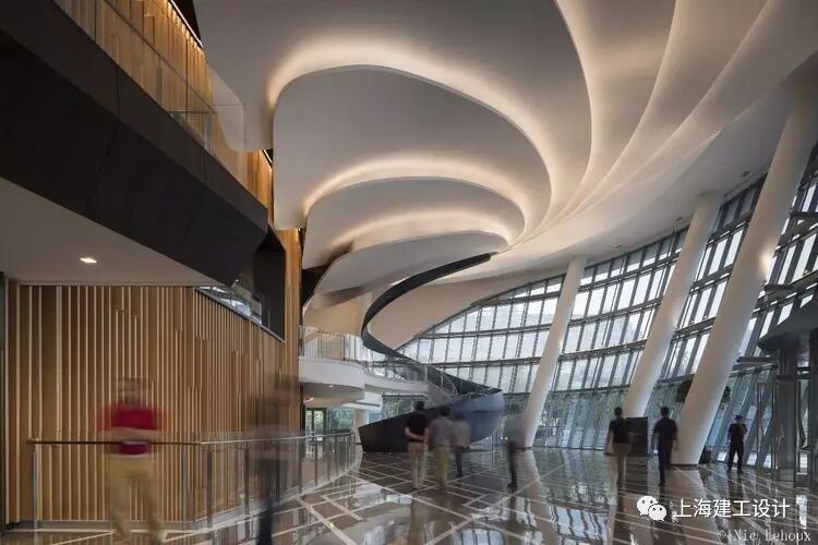 大剧场内的旋转楼梯,仿佛蓝色飘带,与穹顶相连,穹顶的设计也仿若舞者的裙摆,层叠相交。