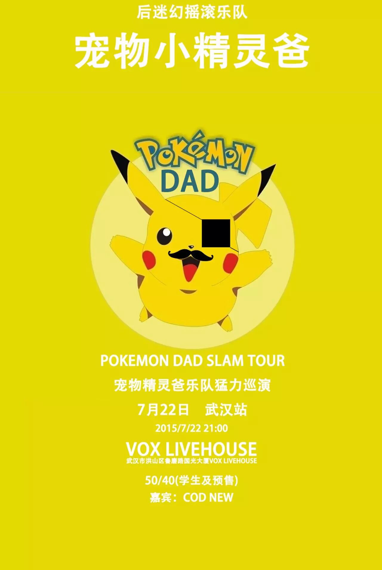 Pokemon Dad (宠物小精灵爸爸)创始于一年前,深圳。它是一只不拘一格的乐队,以后摇滚,数学摇滚,和迷幻摇滚为主要风格(Kevin Daniel Pinner - 鼓手; John Howland - 贝司;Paul Wade - 主唱和吉他;Greg Merrell - 主唱和吉他)他们从美国西雅图,澳四顶,塔拉哈西,和波士顿带了独立摇滚原味。他们的每首歌唯一的共同点就是能够带起听者high得要命。 玩儿着迷幻数学的韵律切分音,弹起怀旧情绪的旋律,Pokemon Dad 探索熟悉而奇特的空灵听觉领域。Pokemon Dad的歌曲富含了不同的寓意,并总带着点儿黑色幽默,反应着人们不同的生活常态。