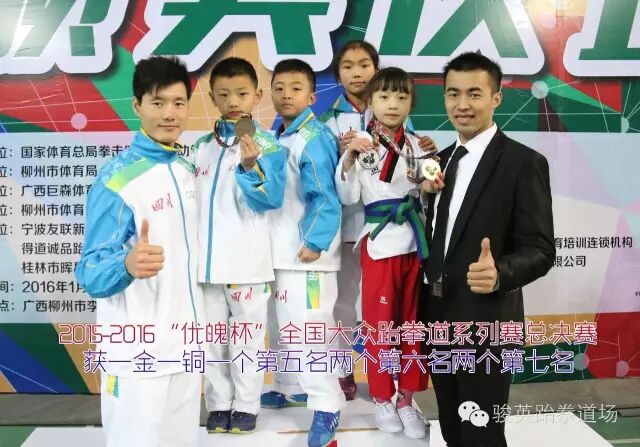 2015年骏英跆拳道学员刘婷婷、苟镇宇,张可,王钰翔4人入选四川省跆拳道代表队,并代表四川省参加了2015-2016年全国大众跆拳道系列赛总决赛,获得一金三银一铜,两个第六名的优异成绩。