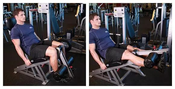 腿伸展,3组,8-10次,最后一组进行连续三次下降组、