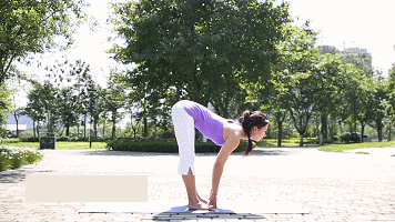 NO.2 双腿分开与肩宽,双手尽可能的碰脚尖,做弯腰的动作。