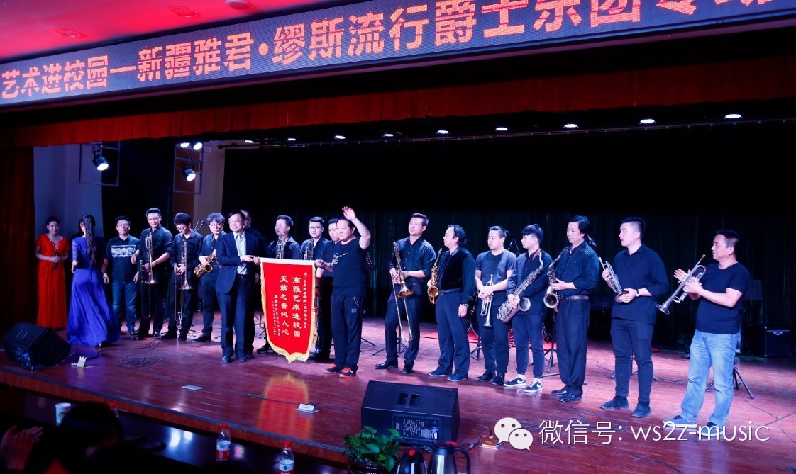 音乐会结束后,我校刘蔚然副校长亲自为新疆雅君•缪斯流行爵士乐团送上“高雅艺术进校园 天籁之音沁人心”锦旗,并送上亲切祝福,同时也代表校师生欢迎新疆雅君•缪斯流行爵士乐团下一次的到来!