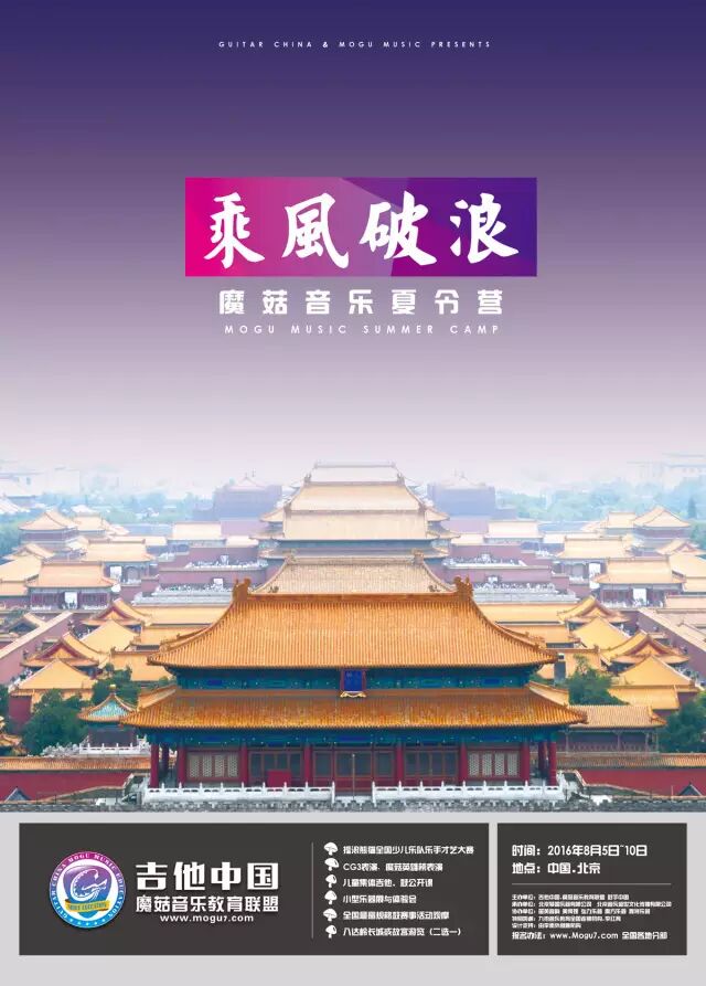 吉他中国2016第2届魔菇音乐夏令营将于8月5日~10日在北京.魔菇音乐基地盛大举行!本次夏令营主题为“魔菇音乐•乘风破浪”, 旨在以文化艺术做媒介、用现代音乐做桥梁,通过举办讲座、大师演示会、比赛、音乐会等形式,让现代音乐进入群众日常生活;将音乐教育寓于旅行、游戏之中,顺应孩子的天性,让孩子从小受到现代音乐的熏陶。同时,通过在活动中面向全国广大一线音乐教师举办师资培训,让吉他音乐普及教育工作得以顺利开展,让更多人有机会学习和接触到现代音乐。夏令营为期6天,包含一系列音乐会、比赛、公开课、座谈会、游览等项目。2016魔菇音乐夏令营是吉他中国.魔菇音乐教育联盟举办的面向全国、寓教于乐,以现代吉他音乐为主的音乐文化交流活动。