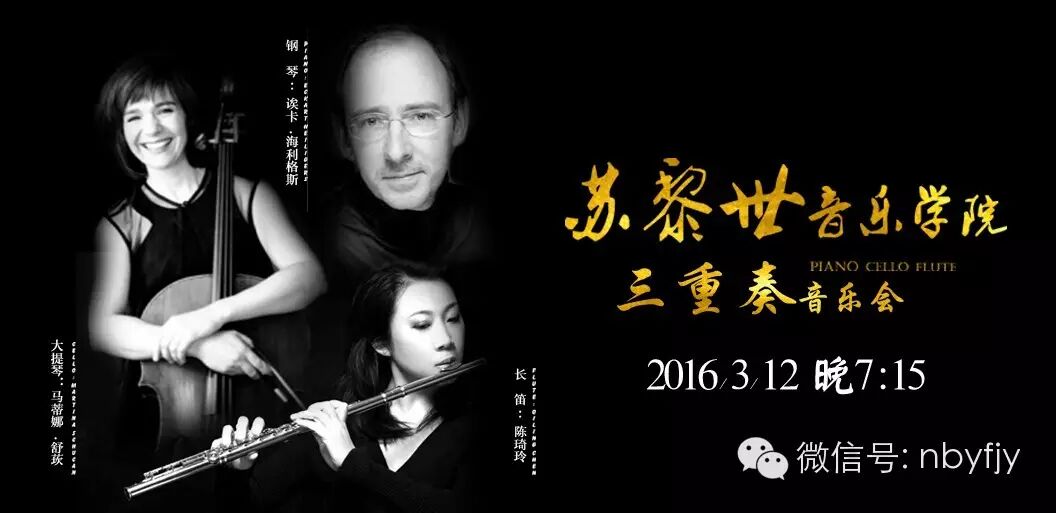 1) 莫斯科郊外的晚上(原版翻唱) 2) 世界上最美的城市(原版翻唱) 3)北京北京(原版翻唱汪峰) 4)光辉岁月(原版翻唱Beyond) 5) Rolling in thedeep在黑暗中翻滚 第二章 1) 非洲 2)传奇(原版翻唱李健) 30怒放的生命(原版翻唱汪峰) 4) 海啸 5) 小船儿(原版翻唱) 第三章 1) 阿迪格的歌曲 2) Thеy don’t care about us(原版翻唱迈克尔•杰克逊) 3)海阔天空(原版翻唱Beyond) 4)一起摇摆(原版翻唱汪峰) 5) 我们的夏天 第四章 1)真的爱你(原版翻唱Beyond黄家驹) 2)月亮代表我的心(原版翻唱邓丽君) 3) 波鲁什卡(俄罗斯民歌改编) 4) Billy Jean(原版翻唱) 5) Sing + Dancemix排舞唱唱唱 更多演出资讯: 3月12日晚上19:15 《苏黎世音乐学院三重奏音乐会》 演出:苏黎世音乐学院 票价:220、160、100、50、20元 《苏黎世音乐学院三重奏音乐会》简介 苏黎世向来被誉为是欧洲交响乐的文化中心,众多交响乐大师纷纷选择这里作为归隐地苏黎世音乐学院也因此在国际交响乐界享有着一流的声誉。2016来中国巡演的三位教授都是具有国际影响力的大师,他们分别是钢琴演奏家:诶卡·海利格斯教授、长笛演奏家陈琦玲教授、大提琴演奏家马蒂娜·舒茨教授,演奏曲目包括海顿的作品《三重奏》、韦伯的作品《三重奏》。 演出曲目 上半场 海顿 Joseph Haydn (1732-1809) 三重奏奏鸣曲(长笛,大提琴,钢琴)Sonata for flute, cello and piano 雷内克 CarlReinecke (1824 - 1920) 女水神奏鸣曲 (长笛,钢琴)Undinesonata E minor Op.167 快板Allegro 间奏曲Intermezzo 稍快的行板Andante tranquillo 终曲Final 下半场 贝多芬L. van Beethoven(1770-1832) 韦伯C. M. von Weber(1786– 1826) 三重奏 (长笛,大提琴,钢琴)Trio 3月19日晚上19:30 《天空之城》音乐会 票价:380/280/180/120/80元 《天空之城》音乐会简 倾听经典旋律,感受震撼原版,追忆永不磨灭的幸福快乐 久石让,以他那充满童心,却又能够阐释哲理的灵性音乐创作,被人们称为触动灵魂的音乐。宫崎骏,可谓是日本动漫当中最具知名度和最受大家喜欢的作品。当久石让遇上宫崎骏,一部部经典动漫随之诞生,一首首音乐传奇划过心际。他们是世界动漫史上的传奇,他们将世界动漫带入了一个黄金时代。感动了70、80、90后的三代人,留下了美好无比的童年回忆。一个个经典的动漫形象,一曲曲熟悉的儿时音乐,承载着一段段童年的美好憧憬和回忆,也在无数个夜晚伴着我们进入甜蜜梦境。当熟悉的旋律再次响起之时,是否会勾起你记忆里那一份纯真、一份童年情结呢? 演出曲目: 1.哈尔的移动城堡 2.千与千寻 3.菊次郎的夏天 4.萤火虫之墓 5.魔女宅急便 6.悬崖上的金鱼姬 7.天空之城. 8.龙猫组曲 9.起风了 10.红猪组曲 11.The Rain(选自菊次郎的夏天) 12.幽灵公主 13.风之谷(选自龙猫) 14.A Chinese Tall Story(选自电影情癫大圣) 15.太阳照常升起(选自电影让子弹飞) 16.天空之城(探戈版) 注:演出曲目以现场为准。 《爱尔兰风情秀音乐会》 演出:爱尔兰月亮神男孩组合 票价:220/160/10/50元 你想知道世界上著名的吉尼斯记录原始赞助商在那里吗?答案是在英伦岛上的爱尔兰吉尼斯啤酒集团;你想知道世界上著名的吉尼斯记录原始赞助商吉尼斯啤酒集团的形象代言人是谁吗?答案是英伦岛上的爱尔兰月亮神男孩组合。该组合是爱尔兰当代光芒四射的几位职业青年歌手(吉米,斯蒂文,费加尔)组成,他们有充满灵感的英伦风格品质,灯火阑珊的声音。通过活力四射的将更多的英伦歌曲,民间音乐,通过歌声,鼓声和电吉他声传递给听众,使他们的存在通过创建一个强大,原始,充满活力的民间/摇滚的声音。 演出曲目(以当天最终节目为准) 开场曲 – 我们的爱 鲍勃马利 Could you be Loved Bob Marley 美好的一天 莱昂国王 Holy Roller Novacaine King of Leon 你是我的所有 月亮男孩 All For You The Luna Boys 不要让我失望 披头士 Don’t Let Me Down The Beatles 布达佩斯 乔治·以斯拉 Budapest George Ezra 你带来好天气 窒息空间乐队 Weather With You Crowded House 爱情的力量 月亮男孩 Love mi amor The Luna Boys 崇拜 史提夫·汪达 Superstition Stevie Wonder 孩子别哭 治疗乐队 Boys Don’t Cry The Cure 燃烧的地板 传统爱尔兰舞蹈 Traditional Irish Intermission 摇滚 猫王 Jail House Rock Elvis Prestley 好伙伴 小理查特 Johnny Be Good Little Richard 经纬线 披头士 Twist and Shout The Beatles 我等你 穆 颂斯 I will Wait Munford and Sons Encore (返场) 明天会更好 传统爱尔兰歌曲