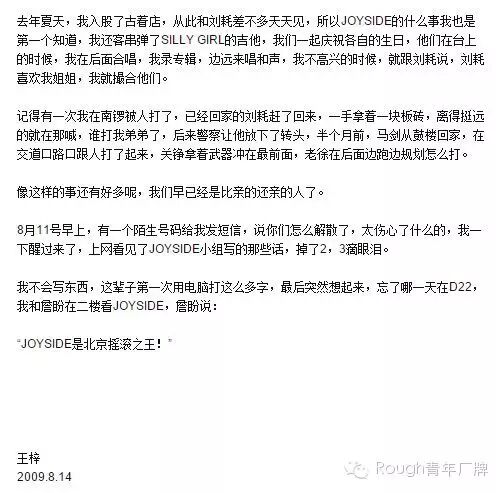 好像是10年4月26号,一群人自发的办了Joyside纪念演出,听说王梓醉醺醺的跑上台,拿起琴说:我唱一首,我是真的特喜欢他们。