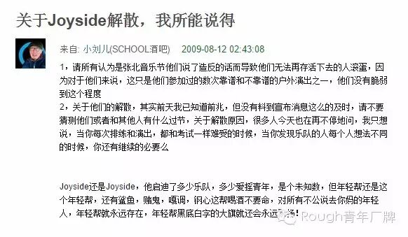 公众号2015年9月4号上线。9月12号是JOYSIDE2009年解散演出六周年。自然而然它作为素材出现在了公众号上。毕竟那时候和现在的关注人数没法比。我直接贴上来吧。零零碎碎的,都基本足以了解他们。