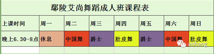 鄢陵艾尚舞蹈成人班全年无休,每周6节课程,不一样的舞蹈,带给大家不一样的体验。开设肚皮舞,爵士,中国舞,瑜伽,有氧操。报名即可学习全部课程。