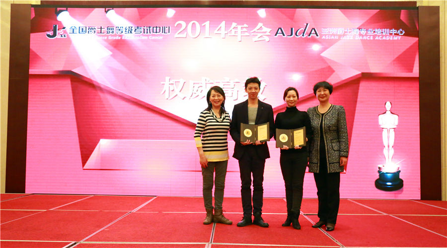 最后为大家公布的是权威高教名单,到底谁会有幸赢得这份荣誉呢?他们就是:邱路、郑莉。王建民女士(全国爵士舞等级考试中心主任,右一)和陆纮女士(左一)向两位高教颁奖。