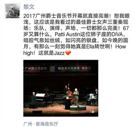 乐迷XQ的分享:今晚印象特深刻的是佩蒂的音乐会让我看到了爵士乐演唱的一个挺freestyle的表演:scat。不知道为什么佩蒂唱歌时我会想起写小作文时的freewriting,想起那种随性随心,真的很容易嗨起来。而且全场一起和佩蒂打节拍时真的很兴奋。第二年来广州爵士音乐节啦,希望会越来越精彩啦!