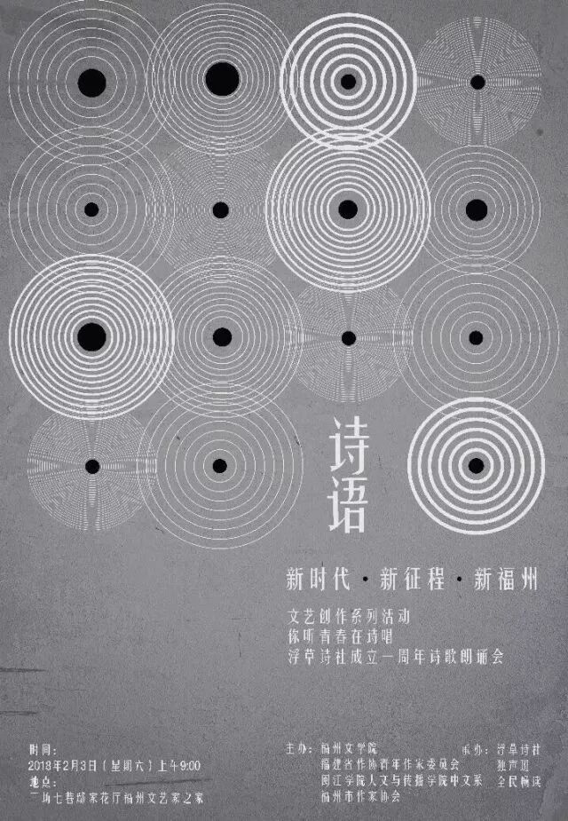 浮草诗社,2016年冬由陈俊杰、赵如添、洪艺松、沈璐容、成业、蔡丽洁、俞道涵等数位鲁迅文学院福州作家研修班的90后学员在研修学习期间成立,是福建地区首个90后诗歌社团。成立一年来,共编印《浮草》诗刊两期,获2017年度福州城市先锋艺文社团奖。该活动旨在展现当下福州写作群体书写新福州、讴歌新福州的热情与实力。点击此处查看详情