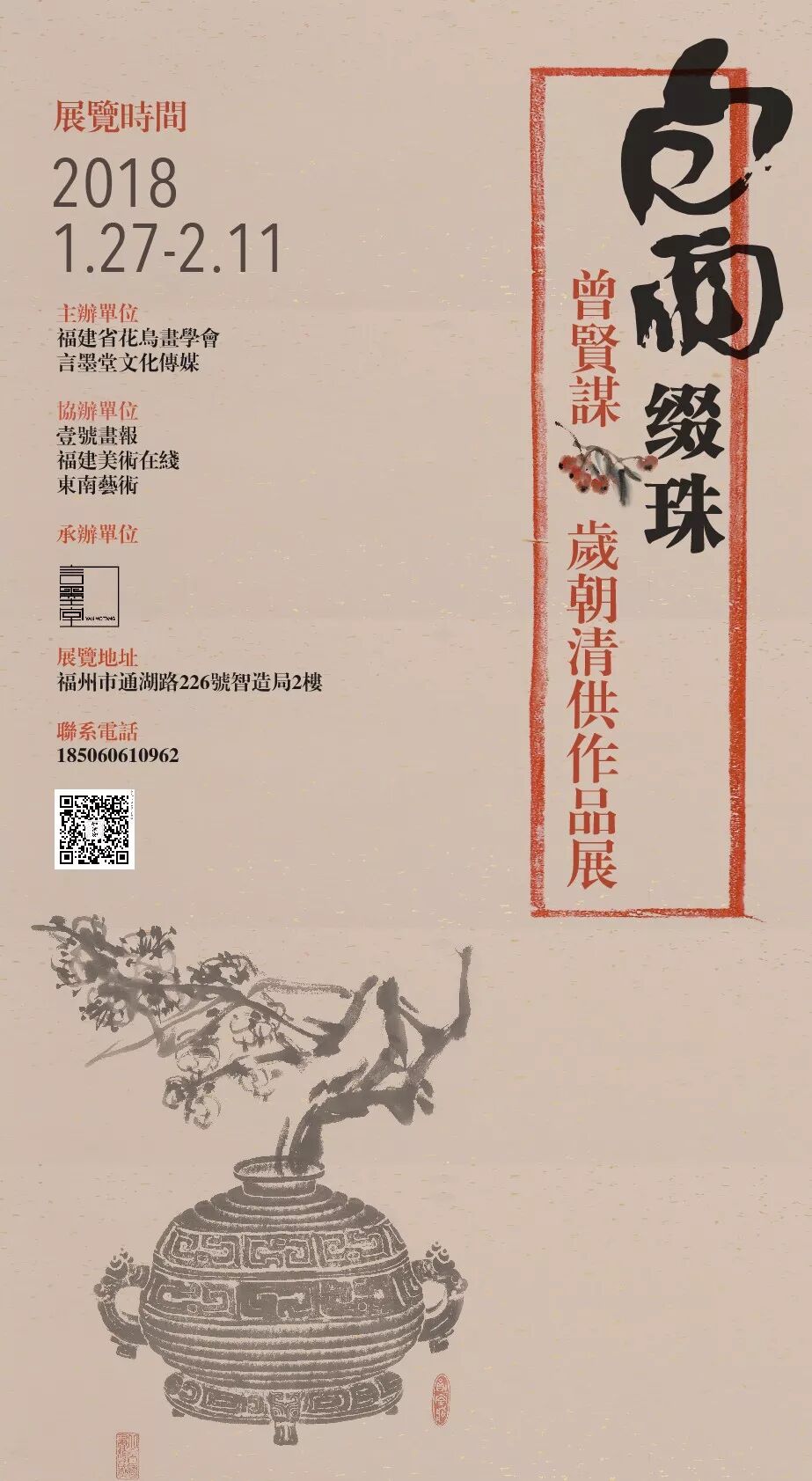 曾贤谋,福建连江人,号白沙主人,生于1941年,毕业于福建师范大学美术系。其作品远收任伯年、吴昌硕、石涛、郑板桥、徐渭等历代名家之长,近师宋省予先生,深得心印,画风奔放洒脱,笔墨苍润遒劲。其独特之处,不在于用笔用墨,而在于善以水滋墨,墨色混融,笔下之景如梦如幻。"岁朝清供"是中国画家爱画的画题,明清以后画这个题目的尤其多。画里画外,别有趣味。此时正是年头岁尾,献上此展,以求新年吉庆、春意盎然,此岁朝清供是也。点击此处查看详情