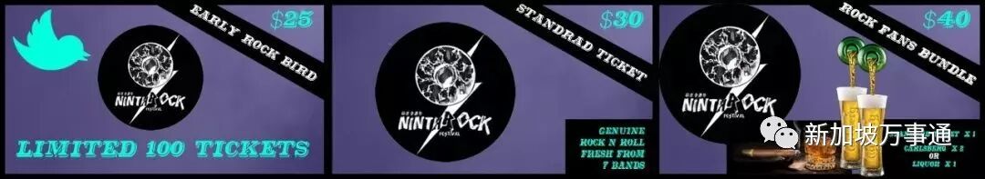 现场票 :S$30;九度商城早鸟票 :S$25;摇滚迷超值套餐 s$40 (内含两瓶啤酒 / 一杯洋酒)。