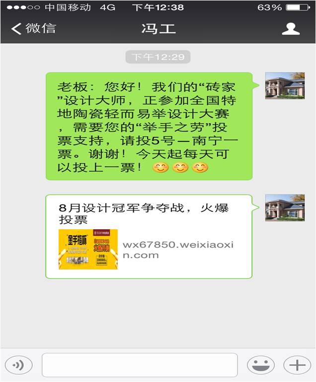 没有退路,才有未来。他是这样说的,也是这样做的,作为总部的区域代表,他身先士卒,从投票开始的第一天就带动全广西各区域经销商团队及微信群为南宁特地投票助力。投票的第二天,冠军席位势在必夺的他,连老板都不愿放过。“老板您好,我们的‘砖家’设计师们正在参加全国特地轻而易举设计大赛,需要您的“举手之劳”投票支持,请投五号王祥发,谢谢。”从他发给董事长的一段微信中可以看出,为了能够帮南宁特地夺冠,他确实是蛮拼的。