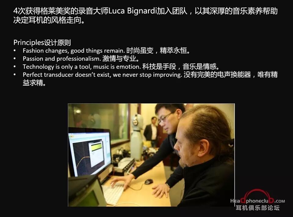 随后,Luca结合自己三十余年的录音经验,为在场HiFi玩家介绍了他在音乐制作中所秉承的原则和理念,以及他如何将其转化为对耳机的要求