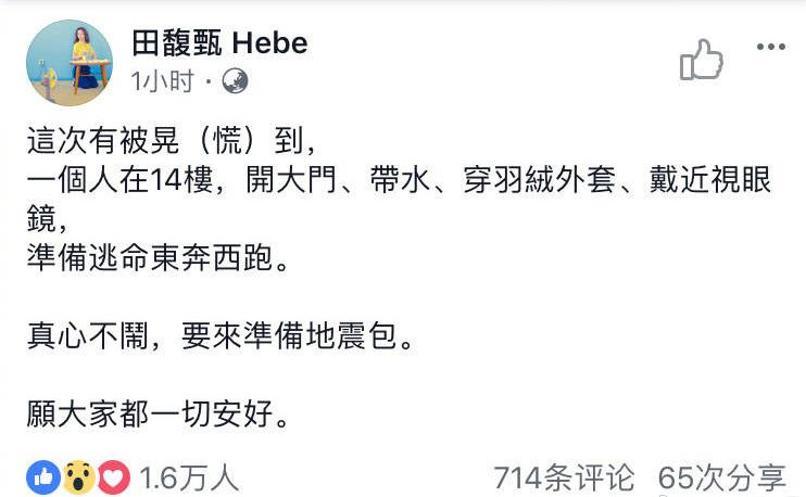 家住14楼的 Hebe 在地震当下也感受到剧烈地晃动,她一个人在家拿好水,穿上羽绒服戴上近视眼镜便开门准备逃命,事后通过脸书发文报平安,“愿大家都一切安好。”