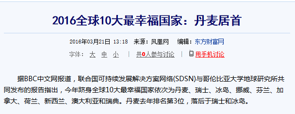 若干年前,迈克尔·布斯曾住在哥本哈根市中心一段时间,他是一个地道的英国人,但娶了个丹麦媳妇儿,所以理所当然,丹麦就成了他的第二故乡。随着丹麦连年被评为全世界最具幸福感的国度,他表示自己无法理解了。这个在他眼里地势平坦、阴暗潮湿、单调沉闷的小国家,文化单一,社会氛围沉闷,税负严重,到底哪里有幸福感?然而各种名目繁多的主观境况认知调查、满意度调查和幸福调查中,虽然丹麦不一定每次都当仁不让地稳居第一,却每次都相差无几;即使它不是第一,也必然是另一个北欧国家居于第一。这太有趣了。