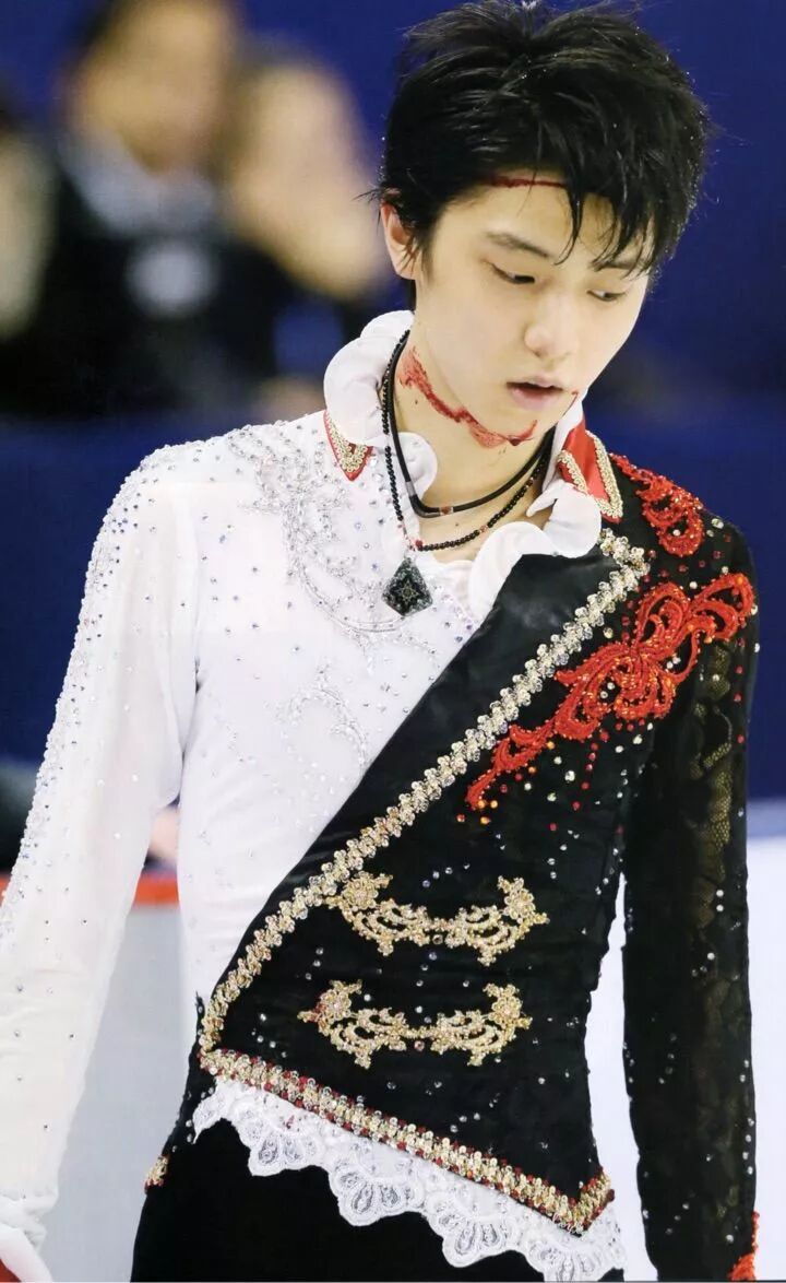 当年不过年仅20岁的羽生结弦在自由滑赛前的6分钟热身,意外地与中国选手闫涵相撞。相撞之后两人情况都很严重,羽生结弦躺在冰上一直大喘,头部都受伤了,现出一道长长的疤,正在不断流血。