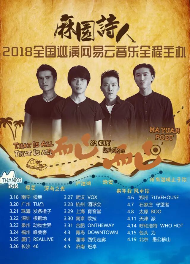 全国越来越多歌迷的期待,也让他们策划出2018年第一次全国大范围巡演,24座城市由南向北,同时也获得网易云音乐提携和支持,获得极高待遇的全程赞助。