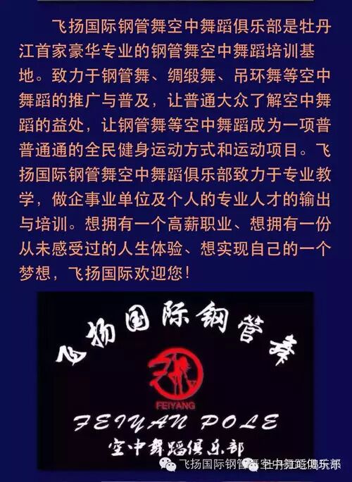 飞扬国际钢管舞空中舞蹈俱乐部,牡丹江钢管舞培训基地,致力于钢管舞事业的推广与普及。