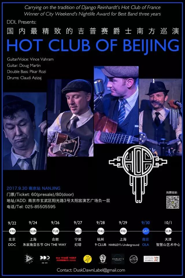 The Hot Club of Beijing is truly a time machine band, which takes listeners on a journey back to the 30s / 40s. They continue to carry on the tradition of legend Django Reinhardt as well as perform traditional gypsy waltzes, American swing classics, fiery Latin pieces and even traditional Chinese and Italian tunes. This melting pot of influences creates a unique experience you never been before.