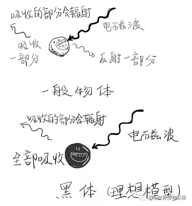 我们先从黑体说起。任何物体在任何温度下都要发射电磁波,同样的,任何物体在任何温度下都要吸收电磁波。但是电磁波可不是那么容易吃得到的,一部分会被物体反射从而吸收不到。于是,我们定义这样一种物质——它可以把一切外来的电磁辐射全部吸收,我们称之为黑体。